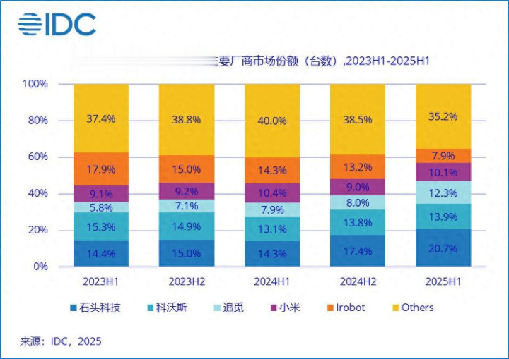 在这场全球变革中,中国品牌凭借供应链效率、渠道掌控力和产品性价比,正走向台前。石头科技作为清洁家电中的领军企业,2025年上半年以20.7% 的市场份额蝉联全球扫地机器人市场第一,成为中国智造出海的新样本。