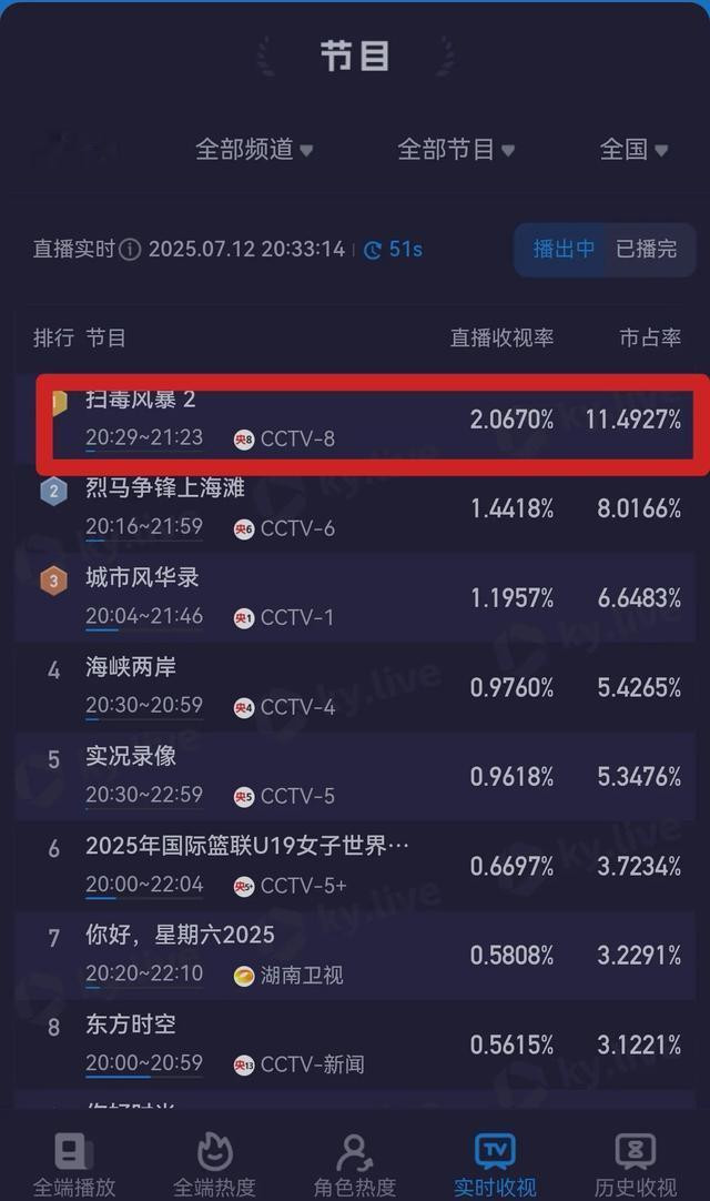 电视剧《扫毒风暴》仅仅播到第2集,就全国收视第一,市场占比11.5%,非凡的好成绩,难以想象4集播完的收视率占比。